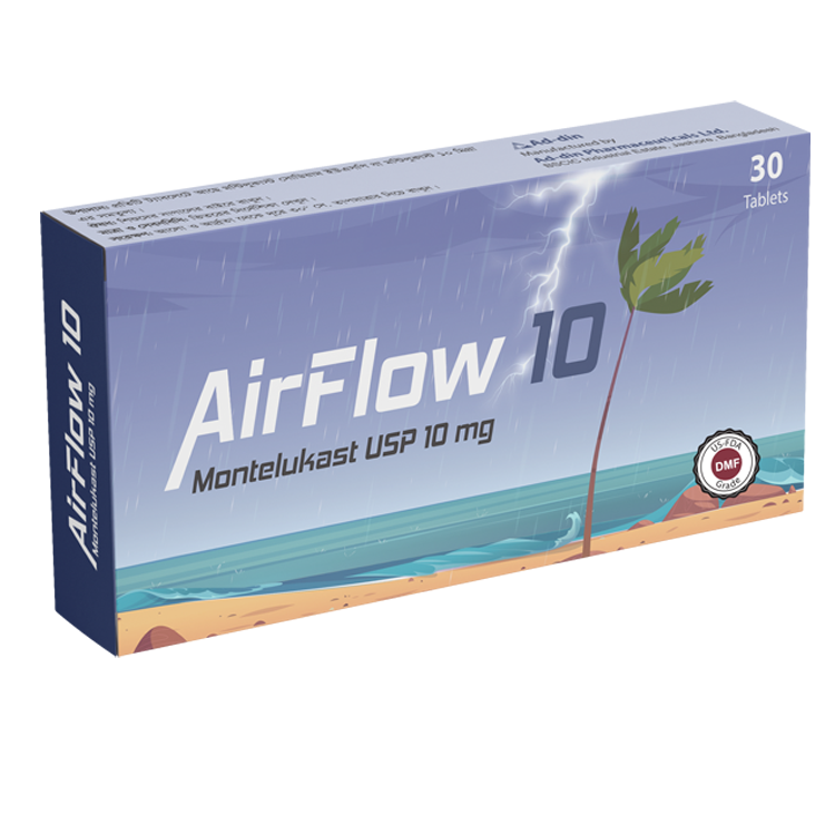 Airflow (Montelukast) is a selective and orally active leukotriene receptor antagonist that inhibits the cysteinyl leukotriene receptor (CysLT1). The cysteinyl leukotrienes (LTC4, LTD4, LTE4) are products of arachidonic acid metabolism and are released from various cells, including mast cells and eosinophils. Cysteinyl leukotrienes and leukotriene receptor occupation have been correlated with the pathophysiology of asthma & allergic rhinitis, including airway edema, smooth muscle contraction, and altered cellular activity associated with the inflammatory process, which contribute to the signs and symptoms of asthma.