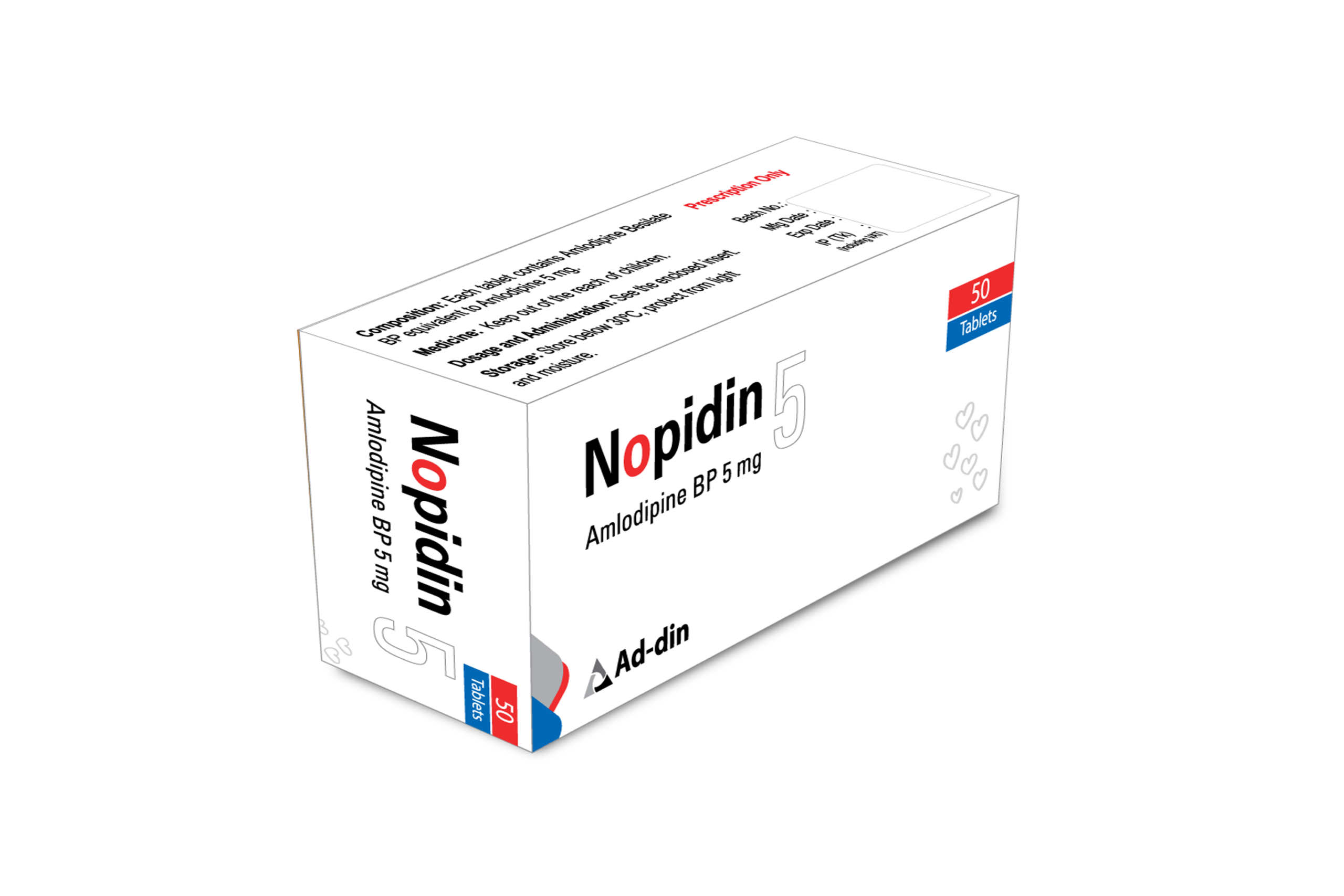 The usual initial antihypertensive oral dose of Nopidin (Amlodipine) is 5 mg once daily with a maximum dose of 10 mg once daily. Small, fragile or elderly individuals or patients with hepatic insufficiency may be started on 2.5 mg once daily dose and this dose may be used when adding Nopidin (Amlodipine) to other antihypertensive therapy. Dosage should be adjusted according to each patient’s need. The recommended dose for stable or vasospastic chronic angina is 5-10 mg, with the lower dose suggested in the elderly and in patients with hepatic insufficiency.